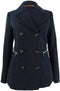 • Stand collar with hood and faux-fur trim; zipper closure at front with snap overlay