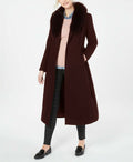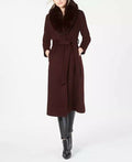 $440 NEW Forecaster Women Fox-Fur-Trim Belted Wrap Maxi Coat Jacket Wine Size 12
