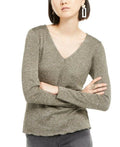 INC International Concepts Women Shiny Knit Top Olive Green V-Neck Long Sleeve L